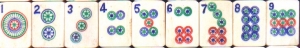 DRAGONS (Red Dragon, Green Dragon, White Dragon; there are 4 of each, for a total of 12; the whites may have a rectangular design or may be blank)