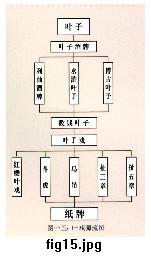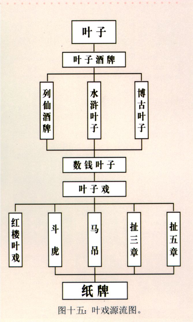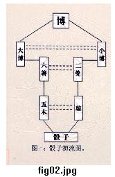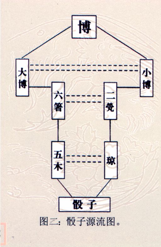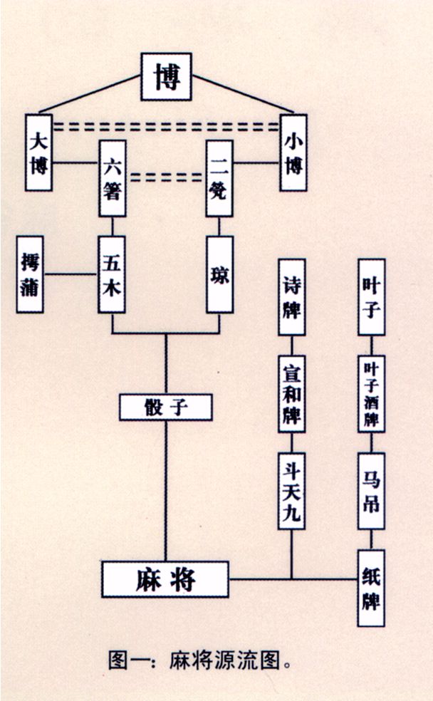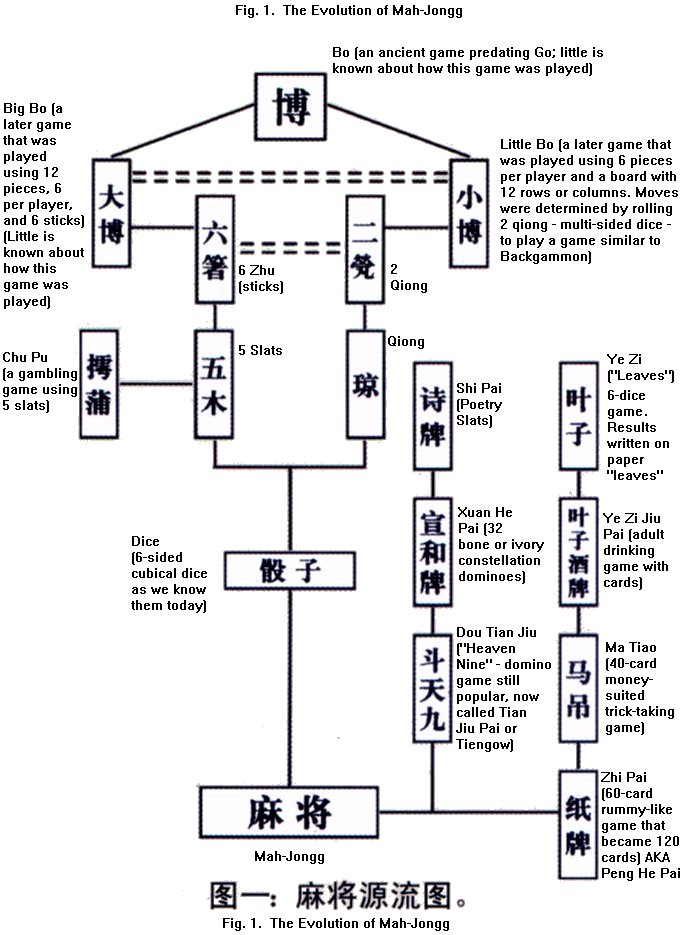 Figure 1. John Low writes: Figure 1 (first half). The single large character at the top is "Bo". "Bo" refers to the extremely ancient board game/s played by Chinese people long long long ago, even older than Go and Chinese Chess. "Bo" is split into 2 different games: "Da Bo" (BIG Bo) and "Xiao Bo" (LITTLE Bo). Virtually nothing is known about the rules of "Big Bo" apart from the fact that it uses 12 pieces (6 per person) and "Liu Zhu" (SIX Zhu). "Zhu" is an old fashioned character for chopsticks, in Japanese pronounced "Hashi". But in this context, "Zhu" is a long thin bamboo object thrown to indicate a number (similar to a YES/NO eraser), hence there are 6 of them. I assume each of these six "Zhu" have a marking on them. Much more is known about "Xiao Bo". Each person also starts off with 6 pieces. The board is 12 rows/columns long (I think) and instead of "Liu Zhu" thrown used for number indication, two ugly items are rolled. These two ugly wooden dice are called "Er Qiong" which means "TWO Qiong". They look like funny soccerballs or dodecahedrons. The pieces move according the rolls and they upgrade at a certain point. The upgraded pieces can either proceed to the final destination, or attack the opponent's pieces. "Little Bo" is very similar to Backgammon. Later on, a few modifications were made to the "Two Qiong", and they were called "Qiong" (the character below the other one) again. The new "Qiong" is now made of stone or jade, and had a few less faces. Note that the Qiong in "Two Qiong" and "Qiong" are two completely different characters, but having the same sound, homophones. The "Six Zhu" for the "Big Bo" game was later replaced by "Wu Mu" which means "FIVE Woods". These are now 5 flat pieces of wood, one side is painted black with a little cow carved on it, the other side is painted white with a wild chicken carved on it. The "Five Woods" itself can be used for a new game called "CHU PU" (the one to the left of five woods in the diagram). This game involves awarding points according to the number attained by tossing the "Five Woods", and is therefore gambling orientated. Over time, Chinese people stopped using "Five Woods" or "Qiong" and merged them together to form convenient, normal 6 sided dice. It is said that the person who initiated this change was Cao Zhi, one of Cao Cao's sons (Cao Cao was one of the main kings during the Three Kingdoms Period 200-280 AD). Also, the popular reason as to why "4" on Chinese dice is red, is because one of the Kings during the Tang Dynasty (618-907AD) was playing a gambling dice game with someone. And the King rolled 6 dice, requiring exactly 2 of them to be "4" in order to win big money. And it did occur, and the King was very happy, so he decreed that all of the 4's be painted red representing good luck. Ironically, this conflicts with ordinary Chinese and Japanese thinking that the number "4" is bad because it sounds like "si/shi" which can mean "Death". Second half of FIGURE 1: I'll start from the left branch. The one just to the right of "Qiong" is "SHI Pai" which means "Poetry Pai". During the Tang Dynasty, Chinese poetry was very popular among everybody. Whenever people were creating a new poem or trying to copy one down for reciting, they would write it on a rectangular piece of wood. Later on, people decided to play a game with "Poetry Pai". A deck of wooden pieces had a short phrase written on them. Friends when playing this game would each draw a Poetry piece and then complete the phrase by making a short poem right on the spot for "fun". Later on again, "Poetry Pai" was used for playing a tricks game (eg Bridge) among the intelligent/literate. I have absolutely no idea how this works (no explanation anywhere). In the Northern Song Dynasty (960-1127), the poetry theme for these Pai were eliminated, however the tricks like game stayed. The new makeover was supposedly created by a government official in the 2nd year of King Hui Zong's rule. These new bone/ivory Pai were called "XUAN HE pai". They look like dominoes, with a total of 227 pips, there are 32 of these dominoes, and are meant to be lousy representations of certain star constellations. The most popular tricks game that developed using "Xuan He Pai" was called "Dou Tian Jiu", which means "FIGHTING SKY/HEAVEN'S NINE". "Xuan He Pai" today is usually called "TIAN JIU PAI" due to the past huge popularity of "Dou Tian Jiu". This game is still played today in China, Hong Kong and Taiwan and some companies still make these dominoes, but they are definitely not as popular as real mahjong or Big Two (a modern Chinese card game) etc. Rules for "Dou Tian Jiu" can be found at http://www.pagat.com/multitrk/tiengow.html For the second branch, the one to the right of "Shi Pai" is now "YE ZI" which means "Leaves". This game was actually a gambling dice game using 6 dice and the "Leaves" were just pieces of paper in which people wrote down what the numbers were thrown, who gets what score etc. Later on when this game wasn't played, "Ye Zi" just was an alternative word for "Playing Cards". For example, the Chinese term for Japanese Hanafuda cards would be "Ri Ben Ye Zi Pai" (Japanese Leaves Pai). The one below "Ye Zi" is "Ye Zi JIU pai" which means "Leaves Wine/Beer Pai". This is one of those early Chinese prototype card decks containing various suits (not familiar) and is a silly adults only drinking game. "Ye Zi Jiu Pai" is part of the "Jiu Ling" strand of old Chinese games. In all "Jiu Ling" games, whoever loses has to drink a cup of wine/beer. And the person who is the least drunk at the end is the overall winner. I think you already know a significant amount about "Ma Tiao" but I shall say some about it. It is a deck of 40 cards, primarily containing Wan (10,000's), Suo zi (money ropes), Wen Xian (a different money ropes) and some other strange cards. This is a tricks game again, and is for 4 players. Each person is dealt out 8 cards with 8 cards unused in the middle of the table. The