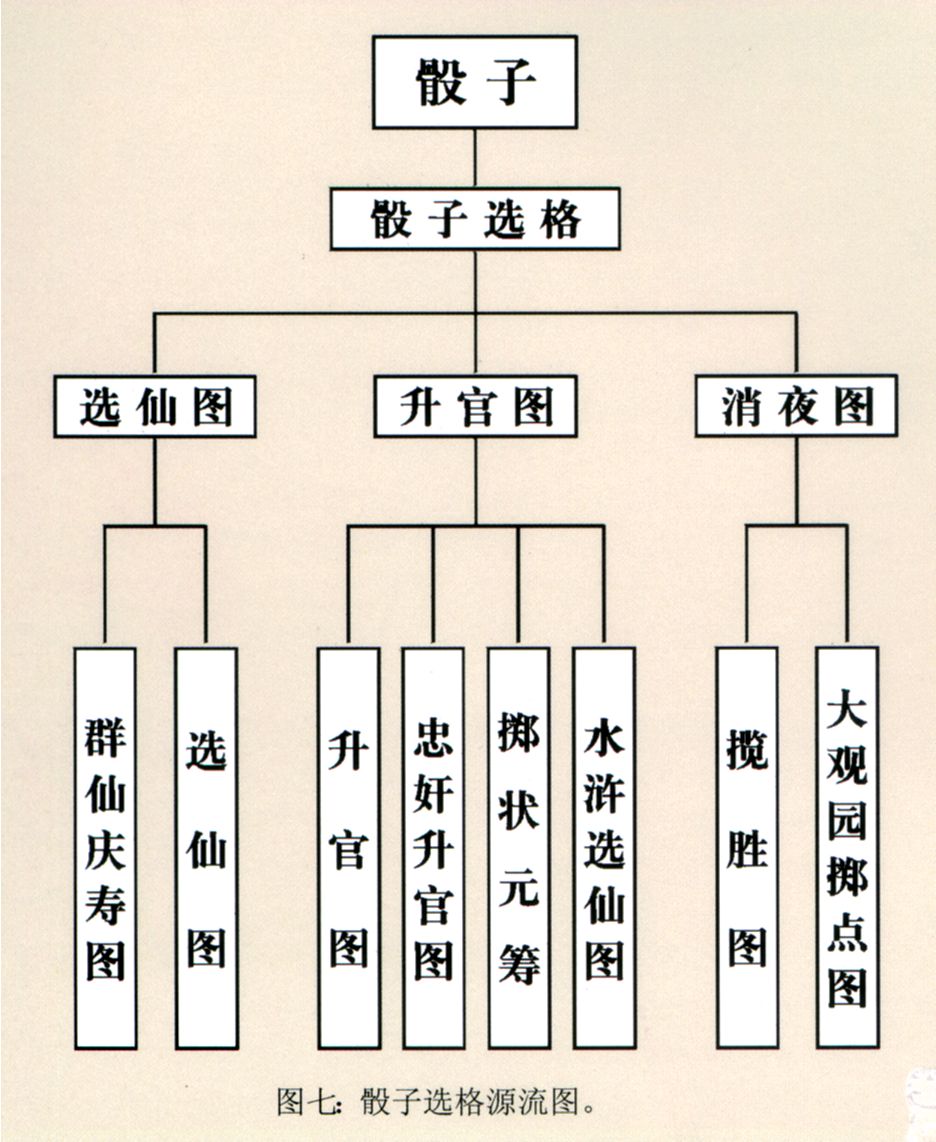 "Sheng Guan Tu" summarizes a bunch of board games that involve gradual promotion or improvements, a bit like monopoly where you increase in property etc. It's split into 4 of them (left to right): "Sheng Guan Tu" (the original game itself, repetition), "Zhong Jian Sheng Guan Tu", "Zhi Zhuang Yuan Chou" and "Shui Hu Xuan Xian Tu". The "Sheng Guan Tu" game itself literally means "Rising Officials (picture)". It is a difficult game first played in the Song dynasty using 4 dice, in which everybody starts off as low ranking workers with counters and aim to gradually rise ranks until they become the King's top minister. There is a board which is split into different sections of the kingdom/land where one must work, eg as foreign minister, granary keeper etc. In order to gain a rank, not only must you roll a specific number on that section to "trigger" a progressive event, but you must also roll specific numbers to increase your personal qualities, thus increase your chances of getting a raise and getting paid counters by your opponents. Whoever rises to the top first might not necessarily be the overall winner (although most likely), because it is judged by who has the most counters at the end. This is quite similar to the board game "Careers" (have you heard of it?). I'm sorry but I only find very little on "Zhong Jian Sheng Guan Tu", but "Zhong + Jian" can mean "Loyalty + Betrayal". I am guessing this game would be similar to "Sheng Guan Tu", but more on this theme and winning respect of others, not on upgrading. "Zhi Zhuang Yuan Chou" is a game that involves 67 sticks