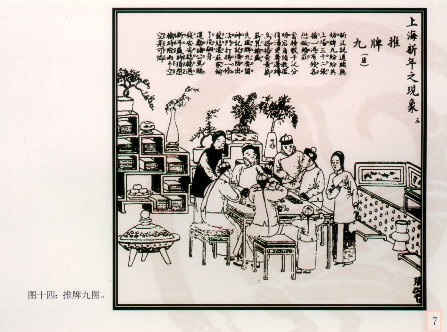 These images are reproduced here solely for scholastic purposes (specifically, so that the history of mah-jongg may be understood by non-Chinese-speaking peoples). Our apologies are given to the DH/BP/MJ for showing the images here, and they will be taken down upon request of the DH/BP/MJ. No permission is granted or implied to anyone to reproduce these images; such permission can be obtained only from the DH/BP/MJ. Translations of the as-yet-untranslated captions are hereby solicited.