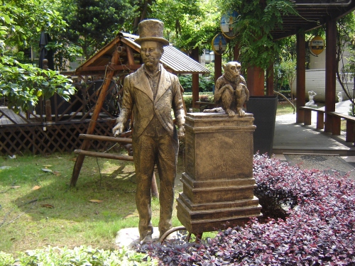 The cafe opens onto a garden patio with some odd statuary. Is that W.C. Fields? With a monkey?