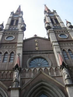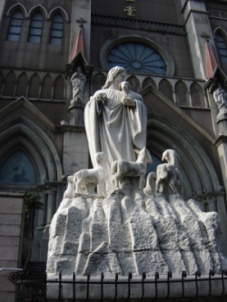 After lunch, Pete and I explored the neighborhood. I needed a pair of sunglasses, since I'd lost mine on the plane, and Sushila wanted a walking cane. Across the main street near the hotel, there was a large Christian cathedral.